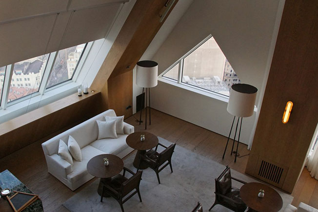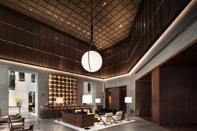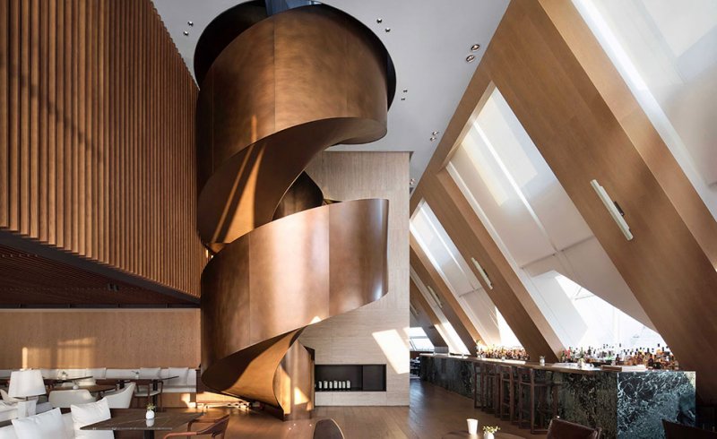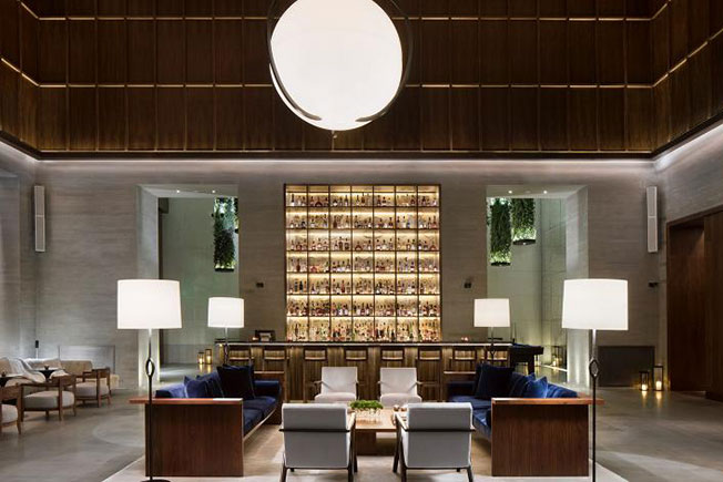 Как в любом фешенебельном отеле, на уровне входа расположен лобби-бар и просторный лаунж, без стойки регистрации. Естественный свет свободно льется в атриум высотой 26 м, а каскады подвесных растений и бархатные обивки мебели смягчают пространство. На всей территории отеля столешницы из каррарского мрамора сочетаются с деревянной мебелью таких брендов, как De La Espada и Stellar Works.