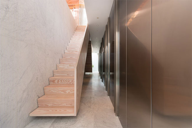 Уходящий ввысь и выступающий за пределы плоской крыши потолок из елового дерева создает в доме ощущение уюта. В свою очередь строгие геометрические линии, большое количество стекла и металла напоминает об американских модернистских домах.