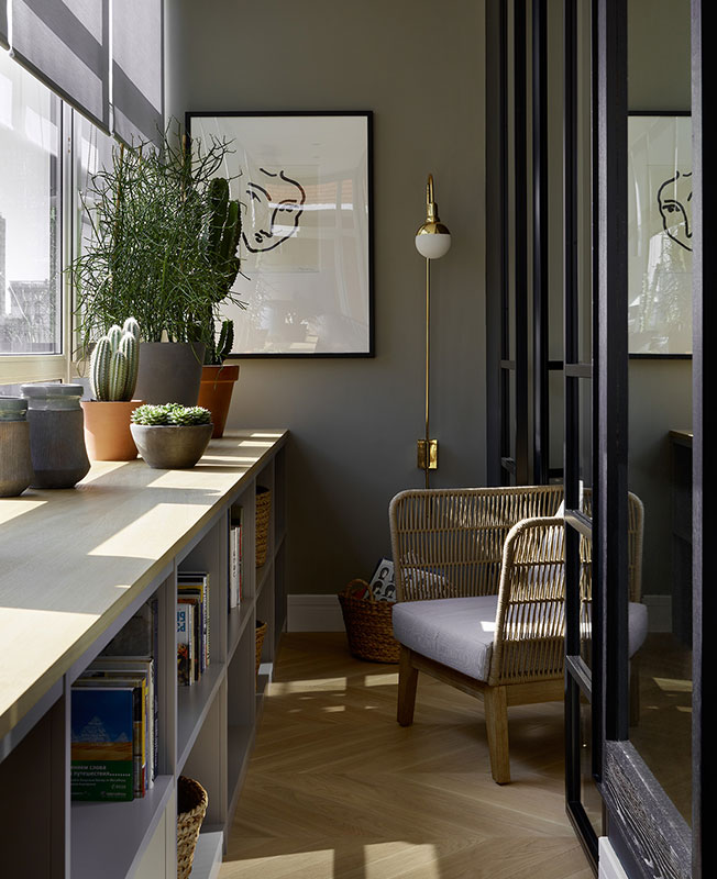 В одном из интервью Айя Лисова, основатель студии Aiya Design, описала свой идеальный интерьер: приглушенные серые тона, натуральные материалы, интересные светильники. Проект в ЖК «Соколиное гнездо» на Ленинградском проспекте близок к идеалу. Рассказывает Айя Лисова. nonehttp://instagram.com/aiyadesignhttps://www.facebook.com/aiyadesignaiyadesign.ru Гостиная. Диван Danton Home отодвинут от стены, за ним расположилась полка, на которую можно поставить картины и декор. Настенный светильник от Lampe Gras создает декоративный акцент и уютное вечернее освещение. Кухня выполнена по эскизу автора проекта. Гладкие фасады серого цвета сочетаются с болотно-зелеными, дополненными лаконичной филенкой. Стол HMD Interiors. Столешница из микроцемента дополнена кантом из шлифованной латуни. «Наша заказчица живет в московском ритме, много работает и много путешествует. Квартиру площадью 88 кв. метров мы создавали для нее и шестилетнего сына. Изначально дизайн-проект был разработан другим автором, но как только начались строительные работы, заказчица поняла, что ошиблась с выбором, и обратилась к нам. Клиенту пришелся по душе стиль Aiya Design. А также наш подход к организации работ, комплектации и авторскому надзору. Гостиная, столовая и кухня образуют опен спейс общей площадью 32 кв. метра. Стол HMD Interiors, стулья G-Plan из петербургского магазина винтажной мебели A Table, светильник над столом Gubi. Настольная лампа Jonathan Adler. На стенах краска Little Greene. Стол HMD Interiors. Столешница из микроцемента дополнена кантом из шлифованной латуни. Винтажные стулья из тика в зеленом бархате британского бренда G-plan куплены в магазине A table. Над столом светильник Gubi. На стене работа Алексея Ланцева. Гостиная. Диван Dantone Home, кресло Julia Grup, настенный светильник Lampe Gras, столик Adaline, настольная лампа Jonathan Adler. Тумба от компании Dantone Home из коллекции City очень нравится хозяйке квартиры. Принт: Берит Могенсен Лопес. На стенах краска Little Greene. Спальню по просьбе хозяйки сделали спокойной, сдержанной. Изголовье кровати Dantone Home почти не выделяется на фоне стены в краске Little Greene. Торшер Robert Abbey, люстра Arteriors Home, настольная лампа Uttermost. Наша основная задача всегда заключается в том, чтобы сделать квартиру максимально удобной для жизни. Несмотря на то, что стены в данном случае были уже возведены, нам удалось внести в планировку несколько важных корректировок. Стол HMD Interiors. Столешница из микроцемента дополнена кантом из шлифованной латуни. Винтажные стулья из тика в зеленом бархате британского бренда G-plan куплены в магазине A table. Над столом светильник Gubi. На стене работа Алексея Ланцева. Основной плюс квартиры — большая лоджия вдоль всей фасадной стены. На нее можно попасть как из гостиной, так и из спальни, тем самым создается интересное пространство с круговым движением. Коридоров в квартире нет. Из холла мы сразу попадаем в гостиную-кухню-столовую, из нее двери ведут в спальню и в детскую. При этом у мамы есть приватное пространство — из спальни через гардеробную можно войти в отдельную душевую. Вид из лоджии в спальню. Картина Алексея Ланцева добавила цвета и настроения. На стенах краска Little Greene. Гостиная. Диван отодвинут от стены, за ним расположилась полка, на которую можно поставить картины и декор. Настенный светильник от Lampe Gras создает декоративный акцент и уютное вечернее освещение. Рисунки Н. Горубовой. Коридоров в доме нет, из гостиной дверь ведет в дет