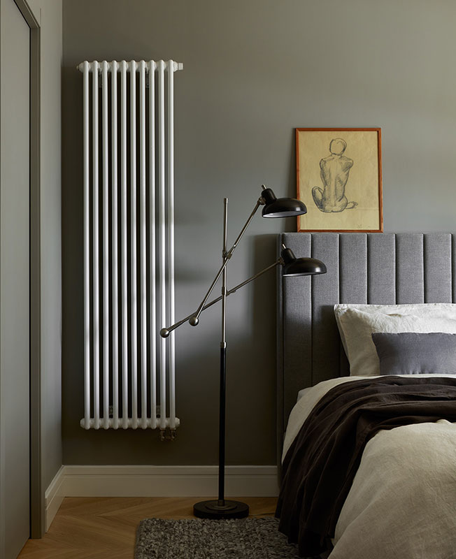Спальня по просьбе хозяйки сделана сдержанной, спокойной. Текстильное светло-серое изголовье кровати Dantone Home почти не выделяется на фоне стен. Торшер Robert Abbey — графичный акцент.