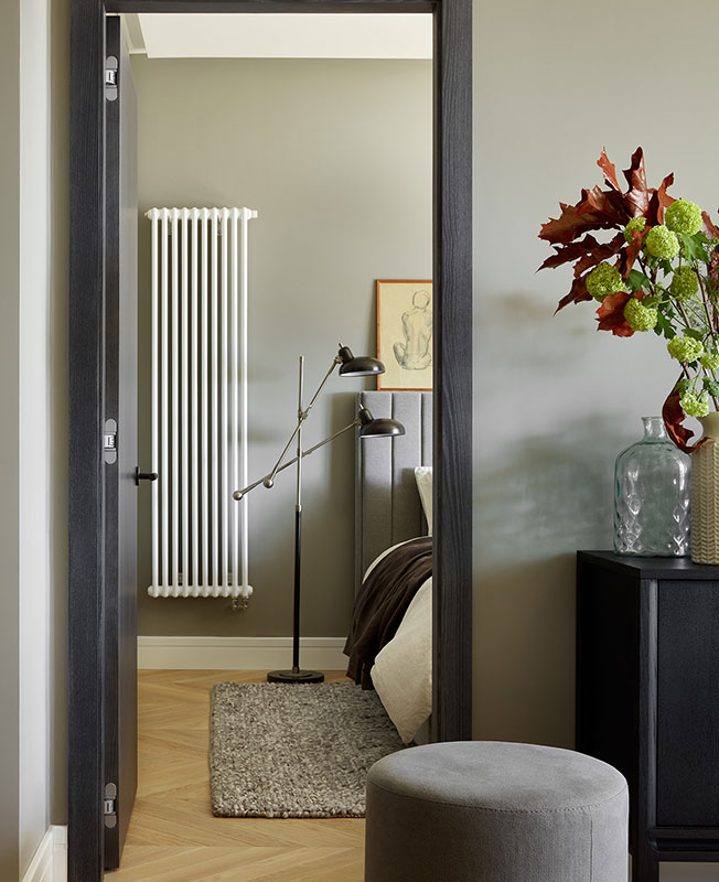 В квартире уже были запланированы стандартные дверные проемы высотой 210 cм. Мы скорректировали их визуально — изготовили наличники до потолка, а полотно продолжили шпонированной панелью. Акцентной деталью стали английские дверные ручки Buster+Punch.