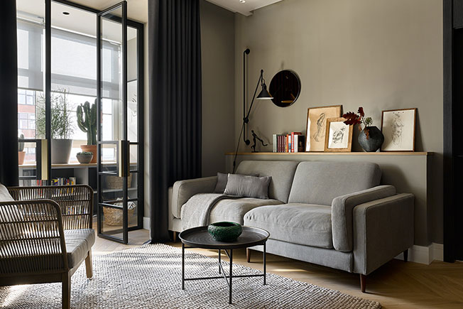 Гостиная. Диван Danton Home отодвинут от стены, за ним расположилась полка, на которую можно поставить картины и декор. Настенный светильник от Lampe Gras создает декоративный акцент и уютное вечернее освещение.