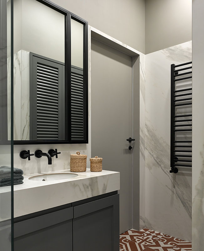 Приватный санузел выдержан в цветовой гамме спальни. Напольная цементная плитка с графичным орнаментом Luxemix отлично сочетается с глянцевыми кирпичиками Equipe на стенах. Тумба изготовлена на заказ. Зеркало Louvre Home. Смеситель Grohe.