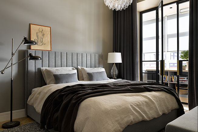 В широких проемах, соединяющих спальню с лоджией, дизайнер установила стеклянные двери с черными металлическими рамами и латунными ручками. Они не только хорошо пропускают свет, но и выступают в роли декоративного акцента.