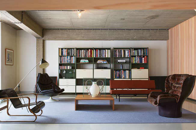 Справа кресло Elda, диз. Дж. Коломбо, 1963. Слева кресло Paimio, диз. А. Аалто, 1932, и лампа Magneto, диз. Х. Филлекес, Artifort, 1956. На столе ваза Big Frozen, диз. В. Сомерс. Стеллаж, диз. А. Кордемейер для Gispen, 1962. Диван, диз. M. Виссер, Spectrum, 1963.