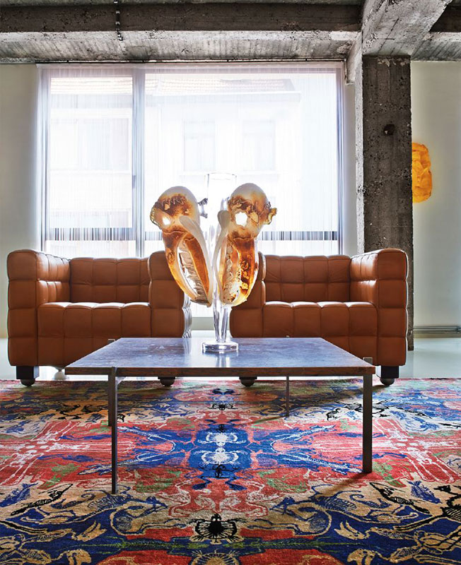 Кресла Kubus, диз. Й. Хоффман, 1910, столик PK 61, диз. П. Кьерхольм, 1956. Хрустальная ваза, диз. Б. Шипек. Ковер Perished Persian, диз. Studio Job, Nodus.