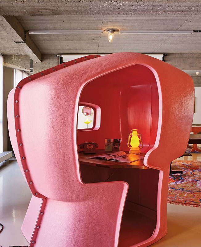 Для приватных бесед по телефону можно уединиться в «коконе» Workskull, диз. Atelier van Lieshout. Модель, задуманная для офисного опен спейса, подошла и для жилого лофта. Производит ее компания Lensvelt. Внутри — винтажный телефонный аппарат.