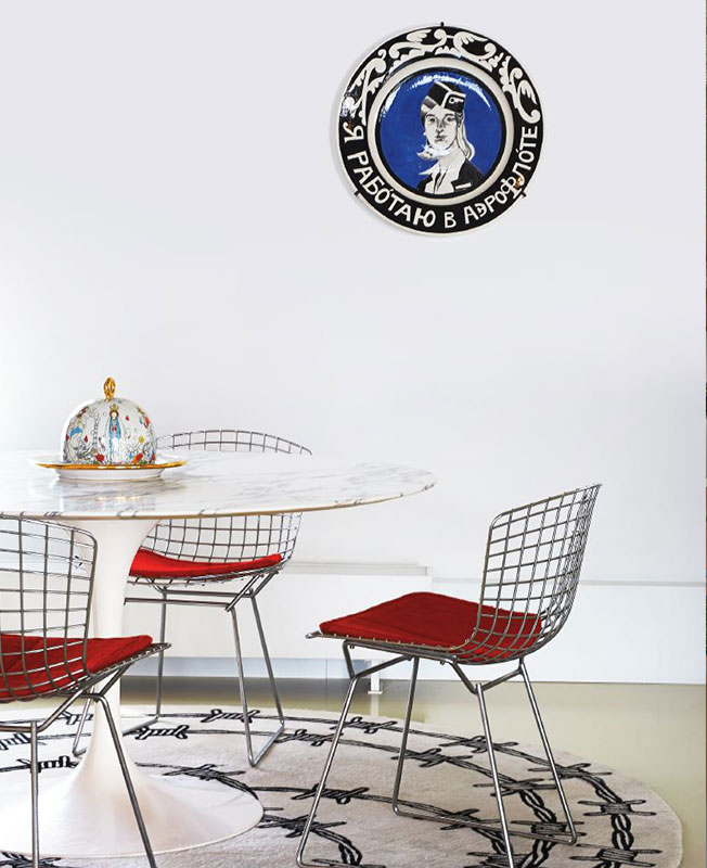 Кухня. Стол Tulip, диз. Э. Сааринен, окружен стульями Diamond, диз. Г. Бертойя (эти предметы выпускает американский бренд Knoll). На полу ковер Wire («Проволока»), диз. Studio Job, Nodus. Автор керамической работы Aeroflot на стене — Ravage, 1990.