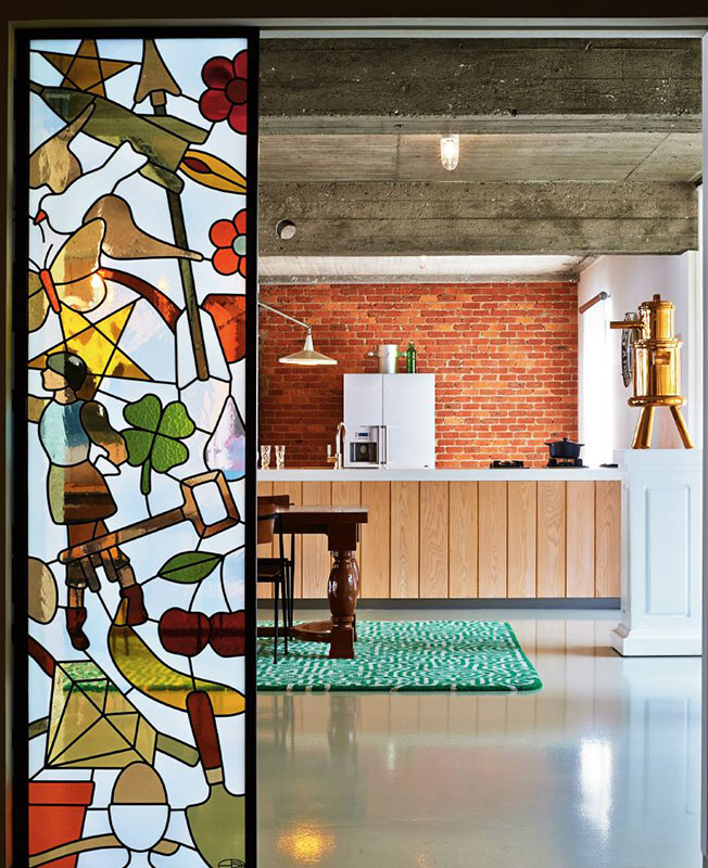 Витражная ширма, диз. Н. Тинагель, отделяет кухню-столовую от рабочей зоны. Справа Pinocchio — работа Studio Job. Цена объекта: 90 000 долл.