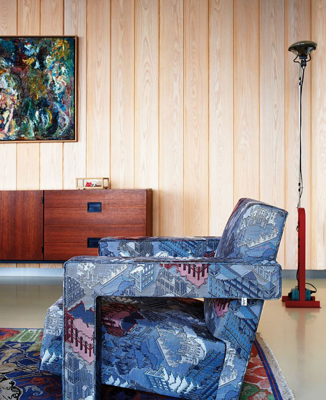 Низкий шкаф DU-03, диз. С. Бракман, Pastoe. На стене автопортрет Э. Леруа, 1975. На переднем плане кресло Utrecht, диз. Г. Ритвельд,1935, переобита тканью Ruins, диз. Studio Job для Maharam. Рядом торшер Toio, диз. А. Кастильони, Flos.