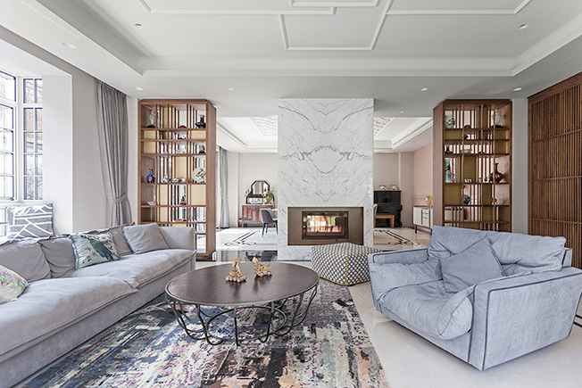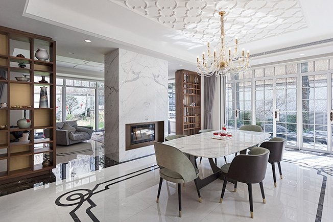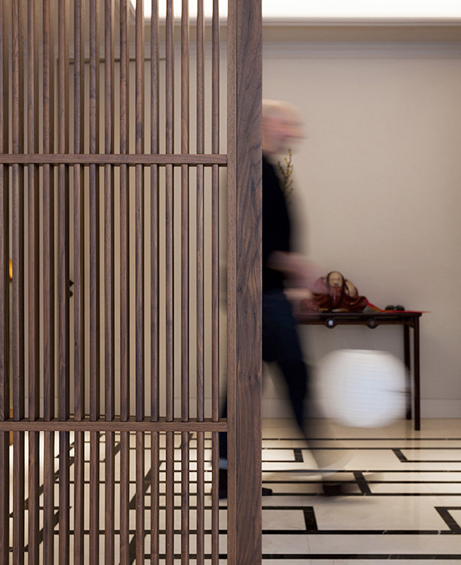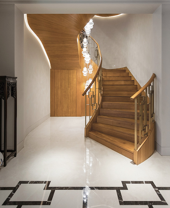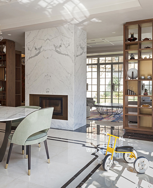Миланская студия Vudafieri-Saverino Partners спроектировала резиденцию на стыке культур в одном из самых «европейских» кварталов Шанхая. Французская Концессия — одна из главных достопримечательностей города, где особенно ощущается атмосфера старого Шанхая. Внимание привлекают множество колониальных особняков, отгороженных высокими заборами от усаженного платанами бульвара. Hunan Lu Villa — пример одной из таких вилл — была построена в 1920 году. Нынешнему владельцу она досталась в полуразрушенном состоянии. Восстановлению здания и прилегающей территории уделили первоочередное внимание. Заказчик хотел, с одной стороны, получить современное, по-европейски роскошное пространство, а с другой — с уважением отнестись к историческому контексту, использовать в проекте типичные китайские мотивы. При реализации фасада провели тщательный анализ материалов, используемых в Шанхае в 1920-х годах. Отсюда типичные для того времени сочетание светло-желтого мрамора, речной гальки и серого камня. Внешняя структура здания была полностью переделана. Появились верхний этаж и большие окна: знаковый элемент, подчеркивающий взаимосвязь внутреннего и внешнего. Всего в резиденции четыре этажа. На нижнем уровне приемная зона и зона обслуживания. Большая часть первого этажа отдана под гостиную. За счет окон в пол она словно продолжается на территории сада. Здесь же кухни — открытая западная и закрытая китайского типа. На втором этаже расположены спальни и татами для чайной церемонии. На третьем находится кабинет, буддийский алтарь и две гостевые спальни. Все уровни соединяет внушительная деревянная винтовая лестница. По словам авторов проекта, она представляет собой «вертикальную душу виллы». Плафоны эффектного каскадного светильника напоминают традиционные китайские фонари. Сердцем виллы стал традиционный китайский сад: он полностью закрыт и защищен от посторонних взглядов, но при этом все пространства дома открыты к нему. Сад был разработан в сотрудничестве с экспертом по фэн-шуй, чтобы уважительно отнестись к строгим правилам оформления подобных пространств.