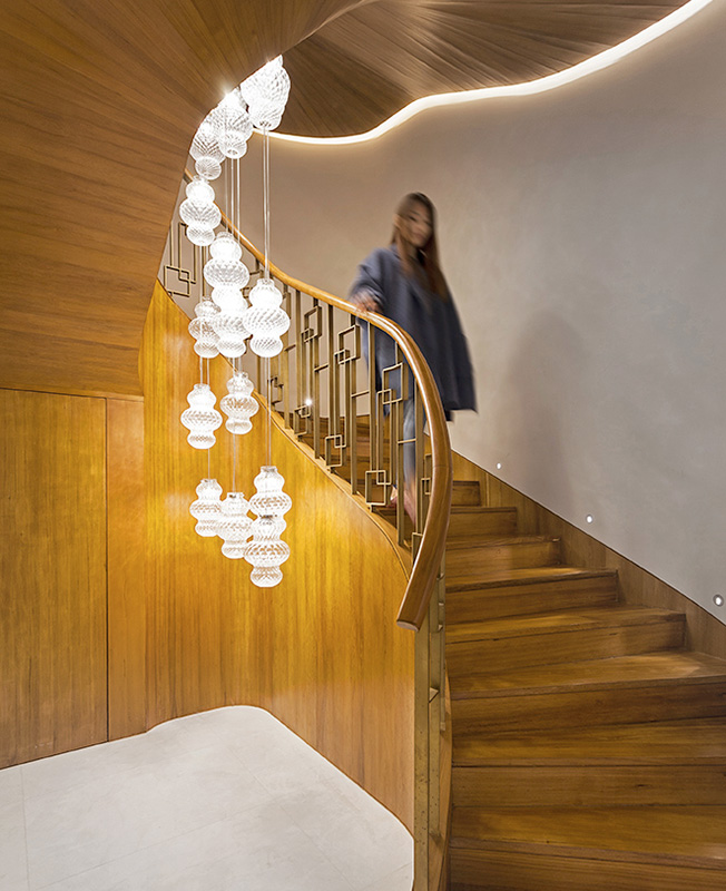 На втором этаже расположены спальни и татами для чайной церемонии. На третьем находится кабинет, буддийский алтарь и две гостевые спальни. Все уровни соединяет внушительная деревянная винтовая лестница. По словам авторов проекта, она представляет собой «вертикальную душу виллы». Плафоны эффектного каскадного светильника напоминают традиционные китайские фонари.
