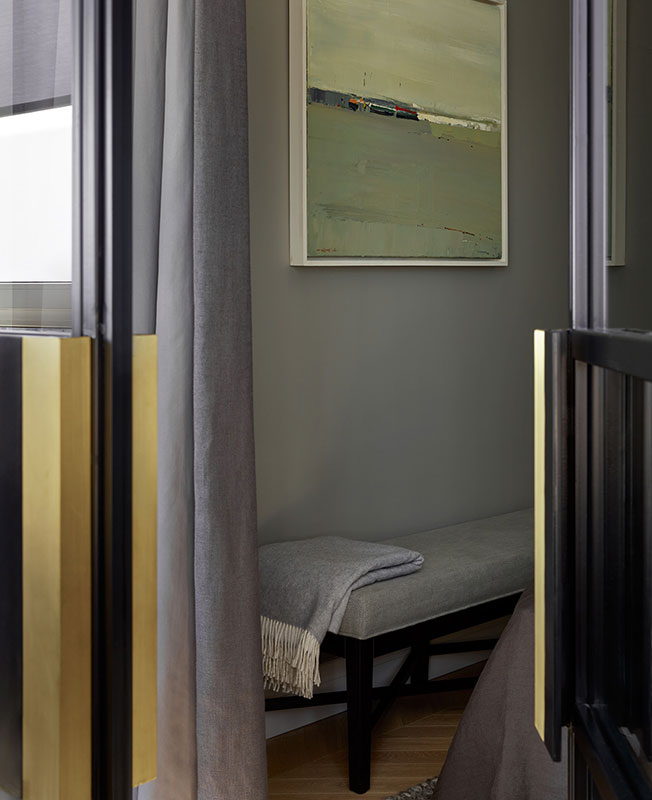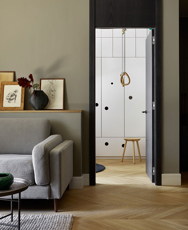 В квартире уже были запланированы стандартные дверные проемы высотой 2,1 м. Мы скорректировали их визуально — изготовили наличники до потолка, а полотно продолжили шпонированной панелью. Акцентной деталью стали английские дверные ручки Buster+Punch.