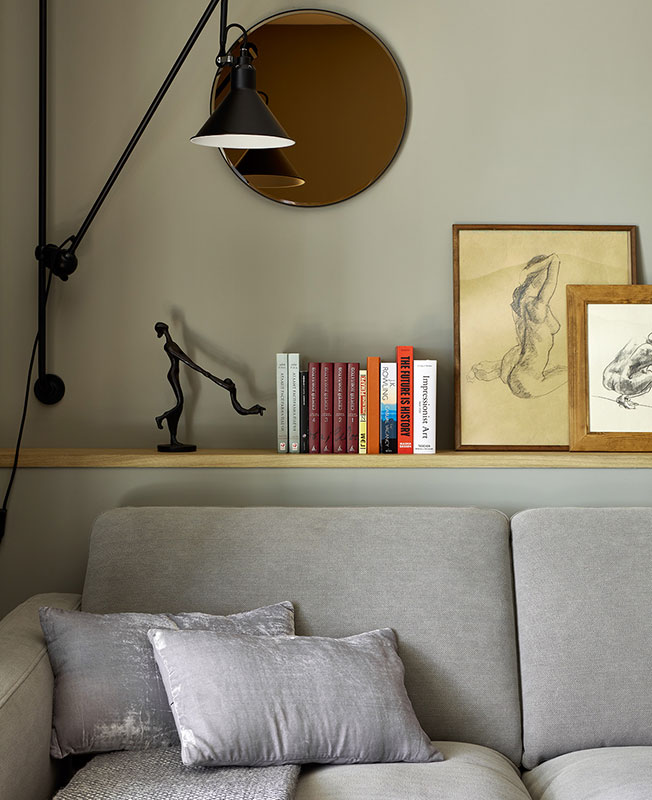 Гостиная. Диван Danton Home отодвинут от стены, за ним расположилась полка, на которую можно поставить картины и декор. Настенный светильник от Lampe Gras создает декоративный акцент и уютное вечернее освещение.