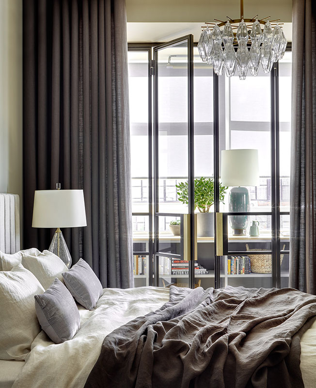 В широких проемах, соединяющих спальню с лоджией, дизайнер установила стеклянные двери с черными металлическими рамами и латунными ручками. Они не только хорошо пропускают свет, но и выступают в роли декоративного акцента.