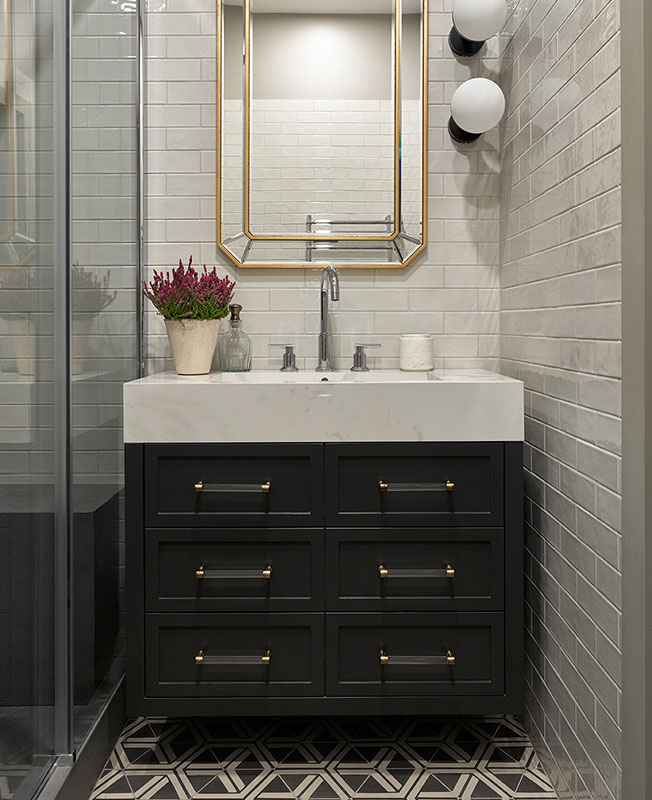 Приватный санузел выдержан в цветовой гамме спальни. Напольная цементная плитка с графичным орнаментом Luxemix отлично сочетается с глянцевыми кирпичиками Equipe на стенах. Тумба изготовлена на заказ. Зеркало Louvre Home. Смеситель Grohe.