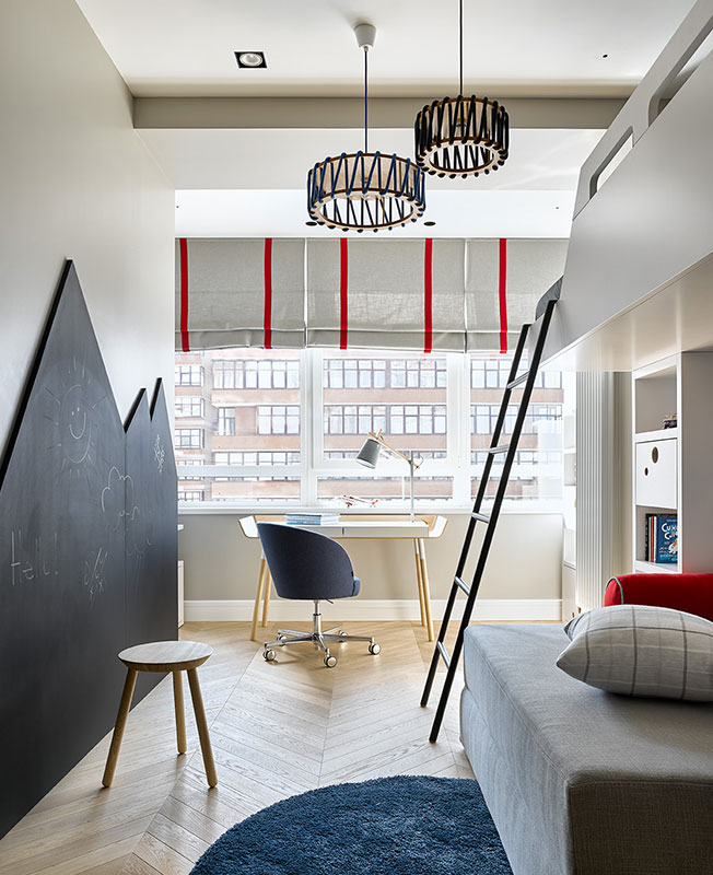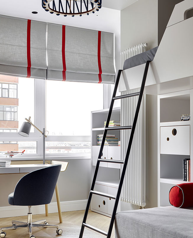 Детская функционально разделена на несколько зон: спортивную сразу при входе, игровую по центру, учебную у окна и спальную на «чердаке». Мы сторонники сдержанной цветовой палитры для детских комнат. Как правило, за основу берем белый и серый цвета или общую гамму квартиры. А настроение уже создают яркие светильники, предметы мебели, аксессуары или текстиль. Детские комнаты должны удобно и легко трансформироваться, ведь дети растут и их вкусы быстро меняются.