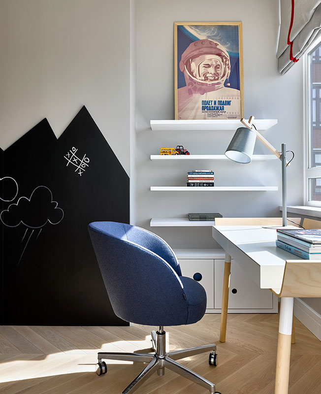 Детская разделена на несколько функциональных зон. «Настоящим открытием для нас стала детская мебель литовской компании Emko. Мы подобрали очень удобный рабочий стол, необычные подвесные светильники и табурет», — говорит Айа Лисова.
