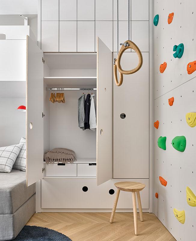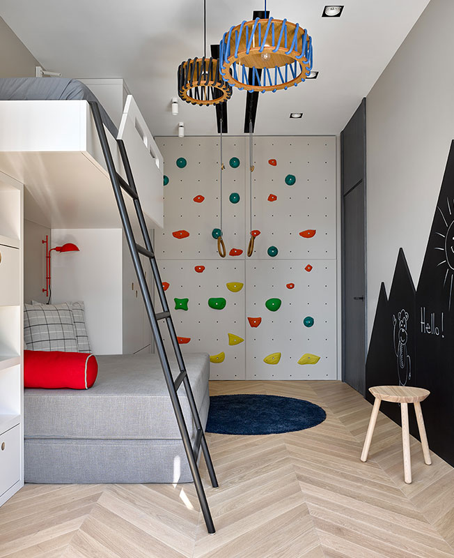 Одну из стен в детской занимает индивидуально разработанный спортивный комплекс — скалодром и гимнастические кольца марки Lillalunga. Спальное место оборудовано на верхнем ярусе, а внизу установлен диван, на котором можно посидеть с друзьями.