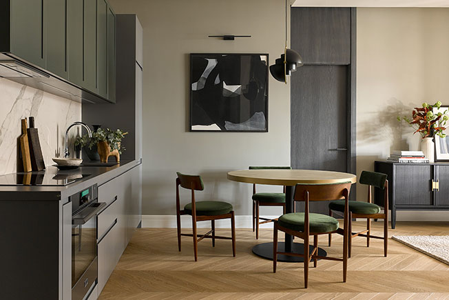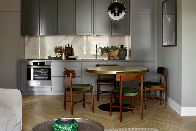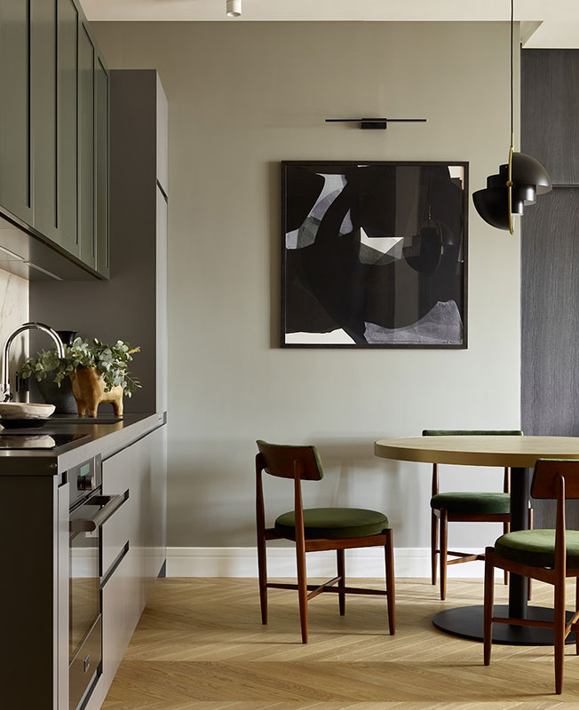 Кухня выполнена по эскизу автора проекта. Гладкие фасады серого цвета сочетаются с болотно-зелеными, дополненными лаконичной филенкой. Стол HMD Interiors. Столешница из микроцемента дополнена кантом из шлифованной латуни.