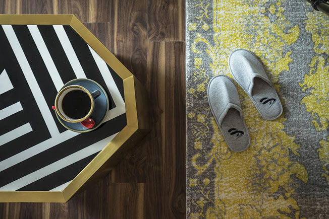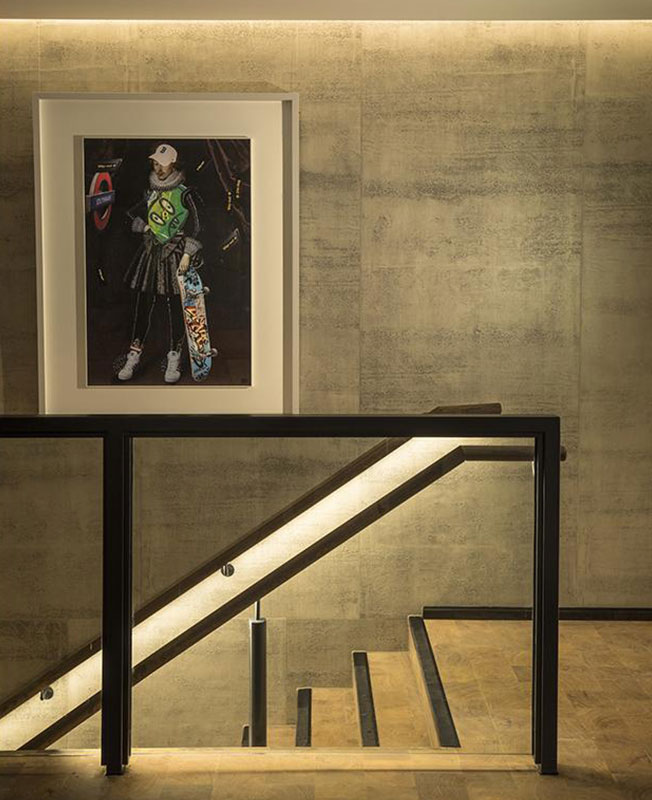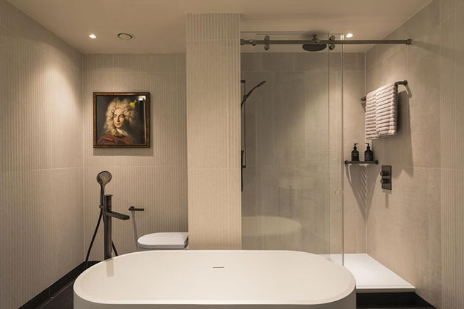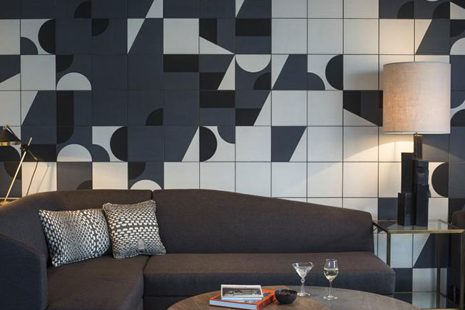 Для стен и пола в зоне бара отобрали Pazzle — выразительную бело-синюю плитку лондонского дуэта Barber&Osgerby, выпускаемую итальянским брендом Mutina. Керамист и иллюстратор Лора Карлин создала для отеля настенные панно из плитки, символизирующие жизнь на Южном берегу Темзы. По мнению авторов проекта — дизайн должен отражать локальные культурные особенности.