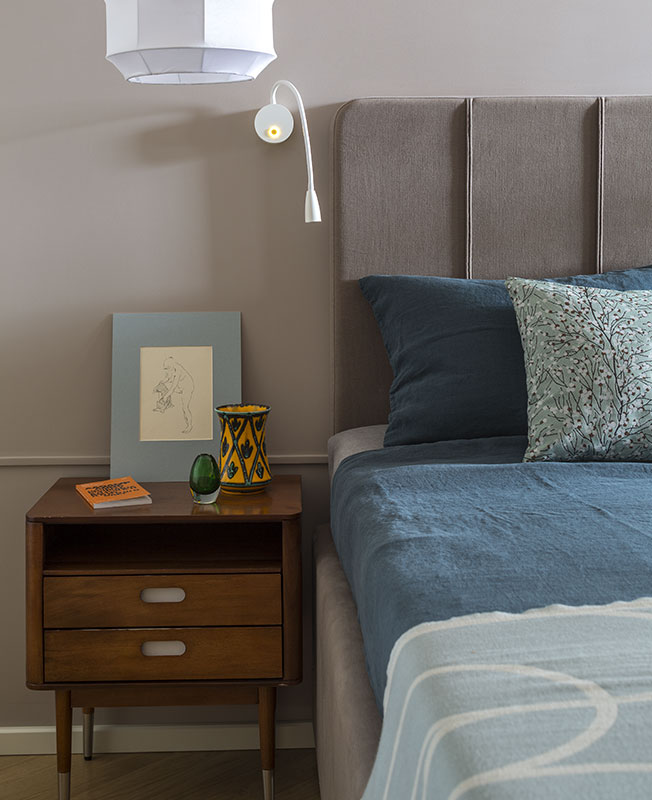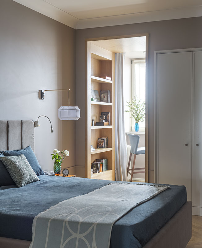 Спальня. Кровать изготовлена по эскизам дизайнеров, цвет изголовья почти сливается с оттенком стен, выкрашеных краской Zoffany. Светильники Markslojd и Centrsvet.ru