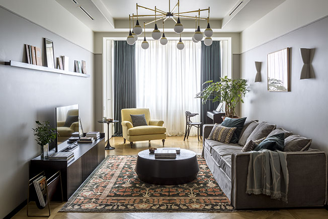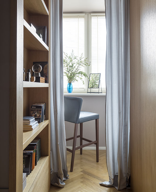 Заказчики — ценители скандинавского стиля, обратились к Елене Зуфаровой и Дине Масленниковой. Дизайнеры создали для них сдержанный, благородный, удобный интерьер. Планировку разработали архитекторы бюро «Ветер веет». Исходные данные были, мягко говоря, не идеальными. Заявленная «свободная планировка» таковой не являлась: в квартире площадью 140 кв. метров стояли восемь несущих колонн. К тому же квартира сильно вытянута в длину, окна и лоджии расположены в торцах. Это значит, что в центр квартиры свет не попадал. Гостиная. Кресло Crate and Barrel. На окнах шторы из бархата Lizzo. Узкая полка позволяет демонстрировать небольшие арт-работы и красивые альбомы, часто меняя экспозицию. Архитекторы предложили присоединить лоджии, что не только увеличило жилую площадь, но и улучшило освещенность. В темном центре квартиры оборудовали постирочную, гардеробную и санузлы — этим помещениям дневной свет не нужен. Гостиная. Диван Casamilano, модель Pillopipe дизайна Паолы Навоне. Ковер: галерея Ansy. Столик Crate and Barrel. Литография Е. М. Курбатова 1970-х. На стенах краски Zoffany оттенка Milk и Farrow