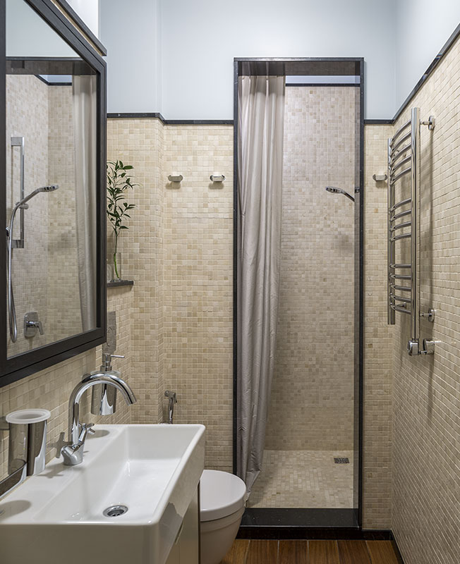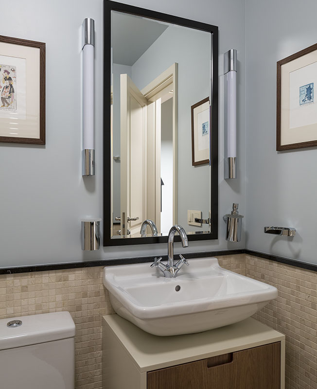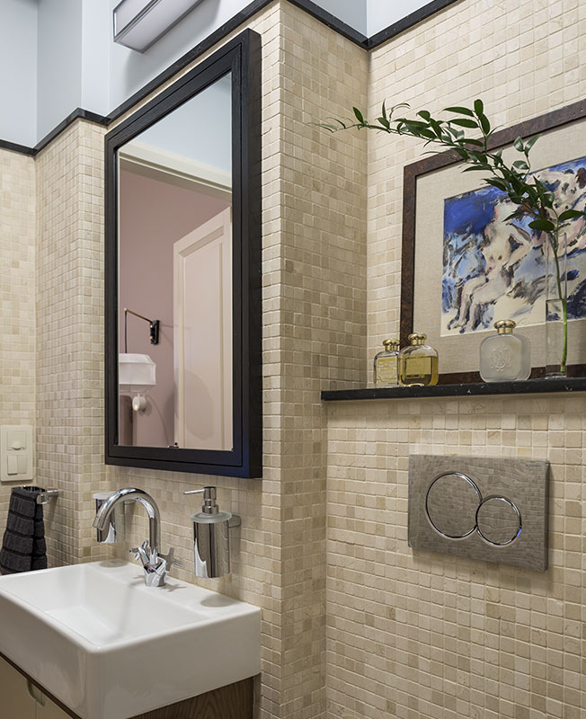 В доме два санузла, оба оформлены в одинаковых материалах: стены отделаны мраморной мозаикой, молдинг из мрамора nero marquina прорисовывает геометрию, верхняя часть стен покрыта краской. Раковина Laufen.