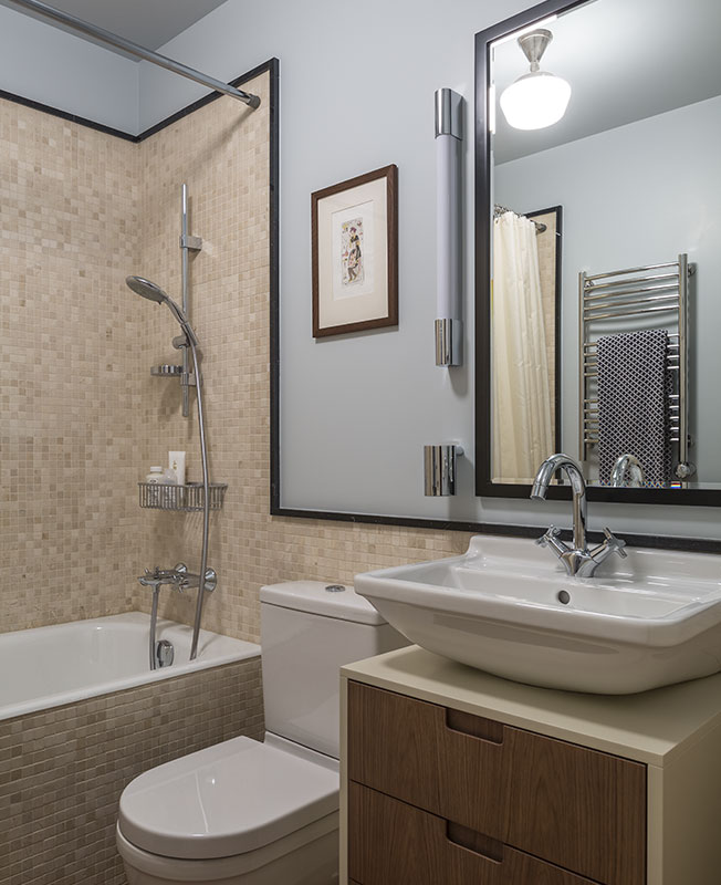 Планировка выстроена по осям, одна из них завершается зеркалом — оно изготовлено в мастерской Oldwood по эскизам дизайнеров. В зеркале отражается входная дверь. Винтажные бра: «Свет и не только 50-60-70-х годов». Потолочный светильник West Elm.