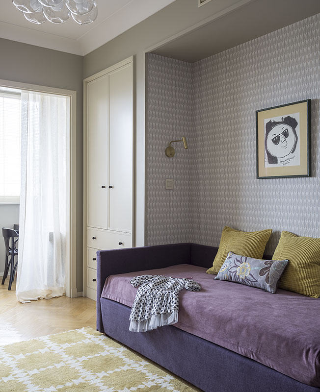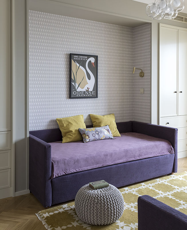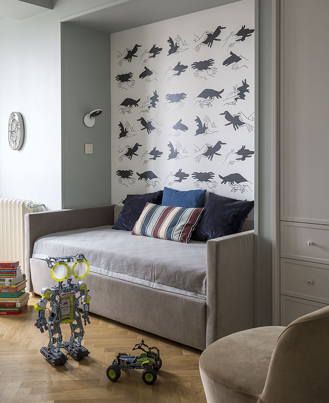 Комната сына оформлена на вырост. Кровать и шкафы изготовлены по эскизам дизайнеров. Обои c «театром теней» от O-design, бра Artemide, светильник Centrsvet, на дальней стене скульптура К. Евменева.