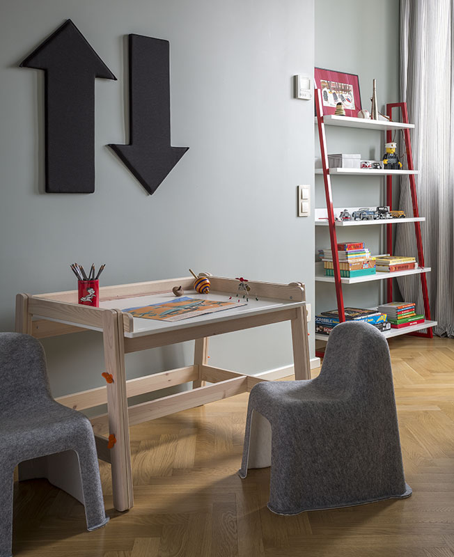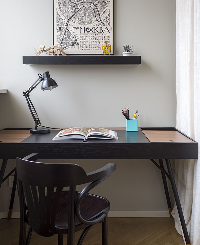 Комната сына оформлена на вырост. Кровать и шкафы изготовлены по эскизам дизайнеров. Стол Ikea, стулья Hay.