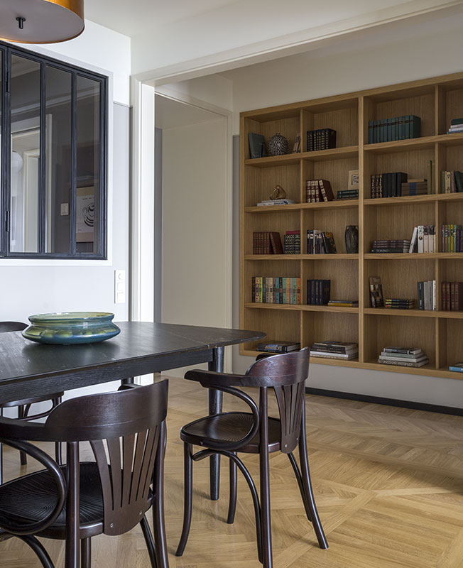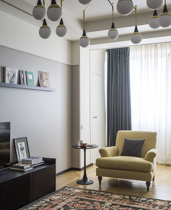 Квартира находится в новом доме, но в старом, обжитом районе на улице Вавилова, из окон видна высотка МГУ. Такая многослойность повлияла на проект, здесь появились спроектированные дизайнерами филенчатые двери и уложенный елочкой паркет. В некоторых точках кажется, что ты попал в старую сталинскую квартиру. Винтажная мебель усиливает атмосферу ретро.