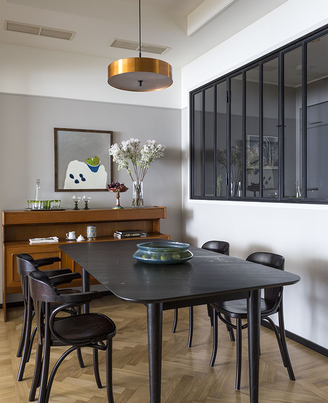 Столовая отделена от кухни прозрачной перегородкой с окном. Винтажный английский буфет куплен в петербугском магазине A Тtable, стол с каменной столешницей изготовлен по эскизам дизайнеров. На столе ваза BoConcept.