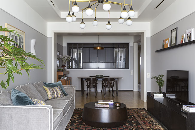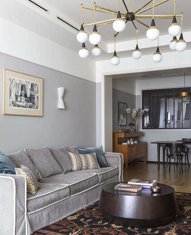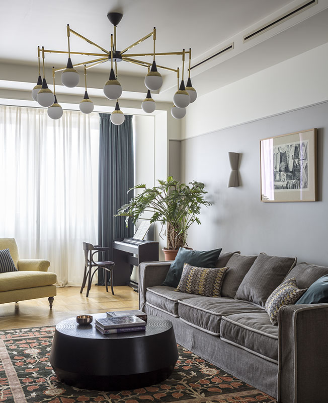 В гостиной главным героем стал диван итальянской фабрики Casamilano, который спроектировала Паола Навоне, в столовой взгляды притягивает английский винтажный низкий шкаф — он куплен в петербургском магазине A Table и появился в квартире одним из первых. Удачная находка — гигантская винтажная люстра из магазина «Свет и не только 50-60-70-х годов»: она «собирает» интерьер гостиной.