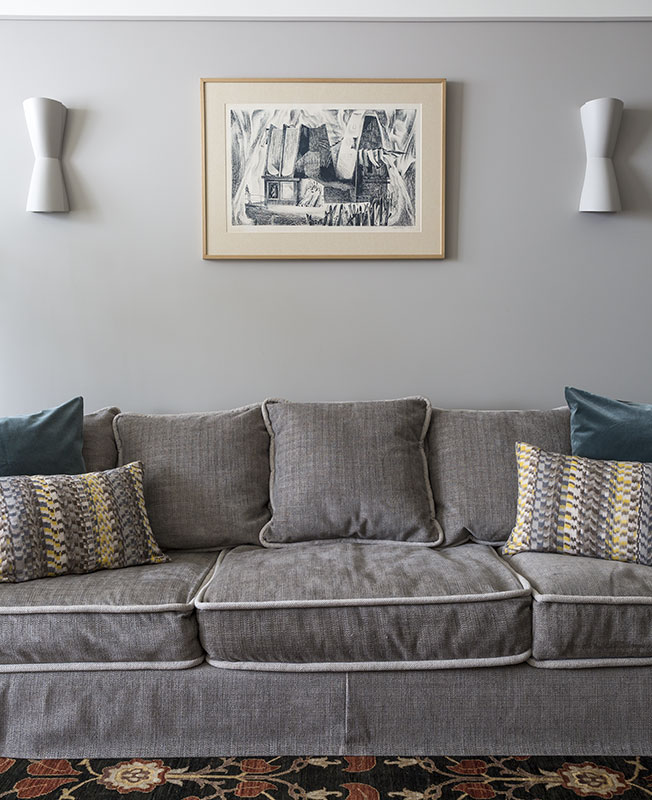 Литография Е. М. Курбатова 1970-х годов, справа и слева гипсовые бра Atelier Sedap, выкрашенные в цвет стен. Диван итальянской марки Casamiilano, модель Pillopipe дизайна Паолы Навоне.