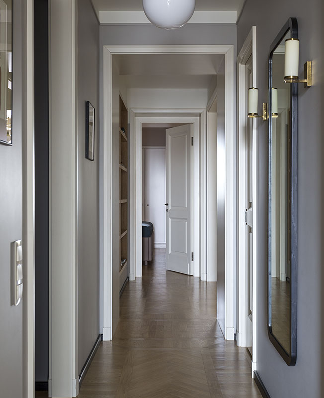 Паркет елкой и филенчатые двери — дань месту: в округе расположены старые дома, а из окон видна высотка МГУ. Двери по эскизам дизайнеров изготовлены в мастерской Ивана Харламова, электроустановочные изделия Simas. В глубине дверь в спальню.