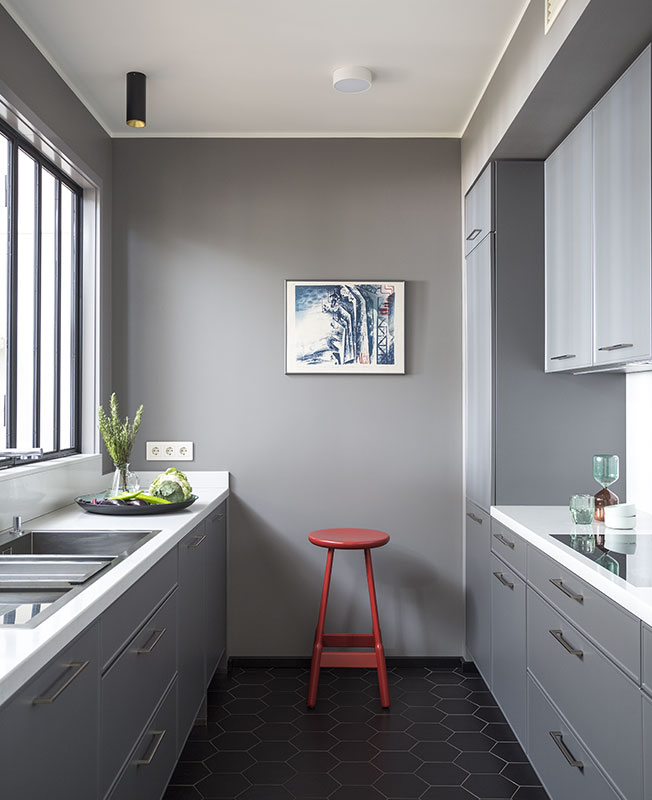 Кухня трактована как техническое помещение. Мебель Nolte Kuchen. Мойка и варочная поверхность расположены у окна, выходящего в гостиную — хозяйка может видеть играющих детей. Табурет Massproduction, на стене литография Е. М. Курбатова 1970-х.