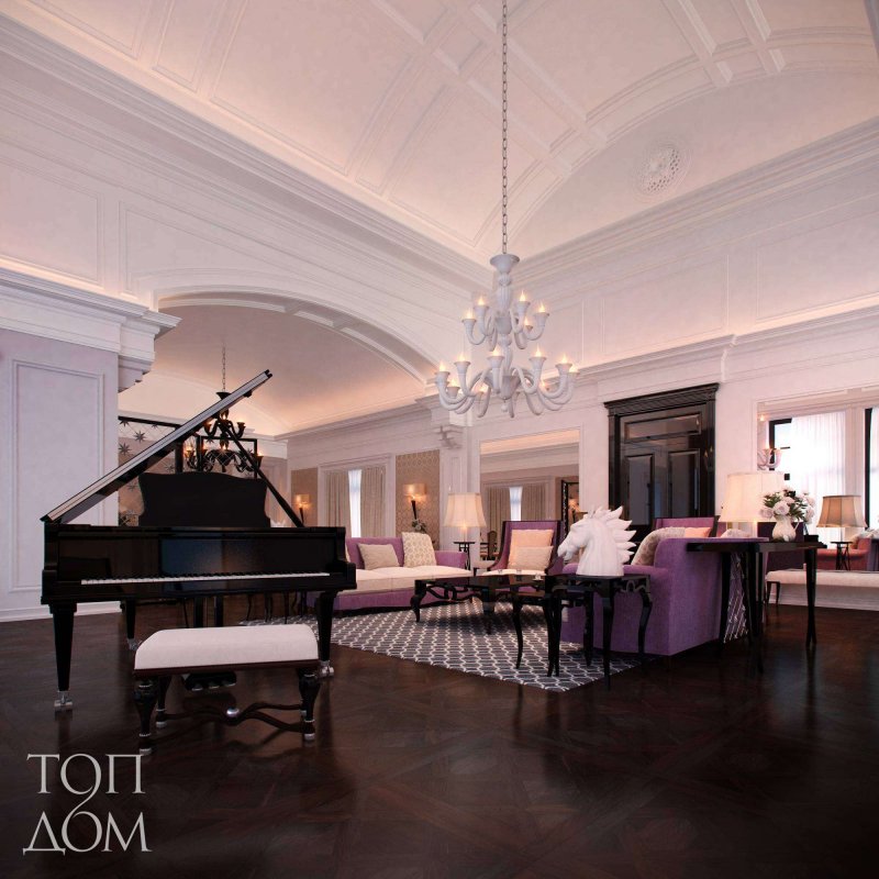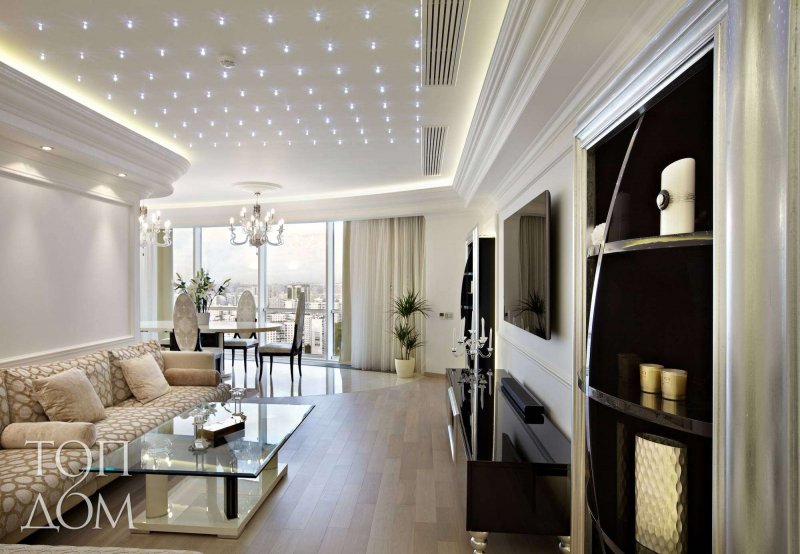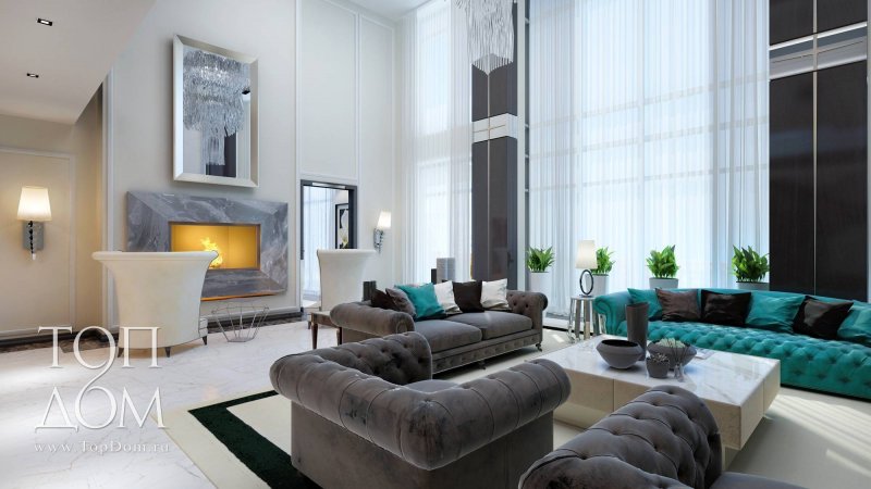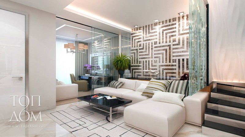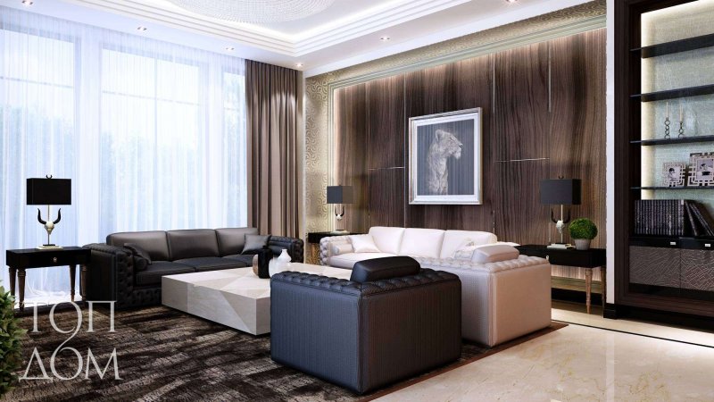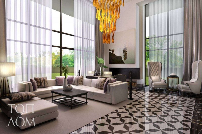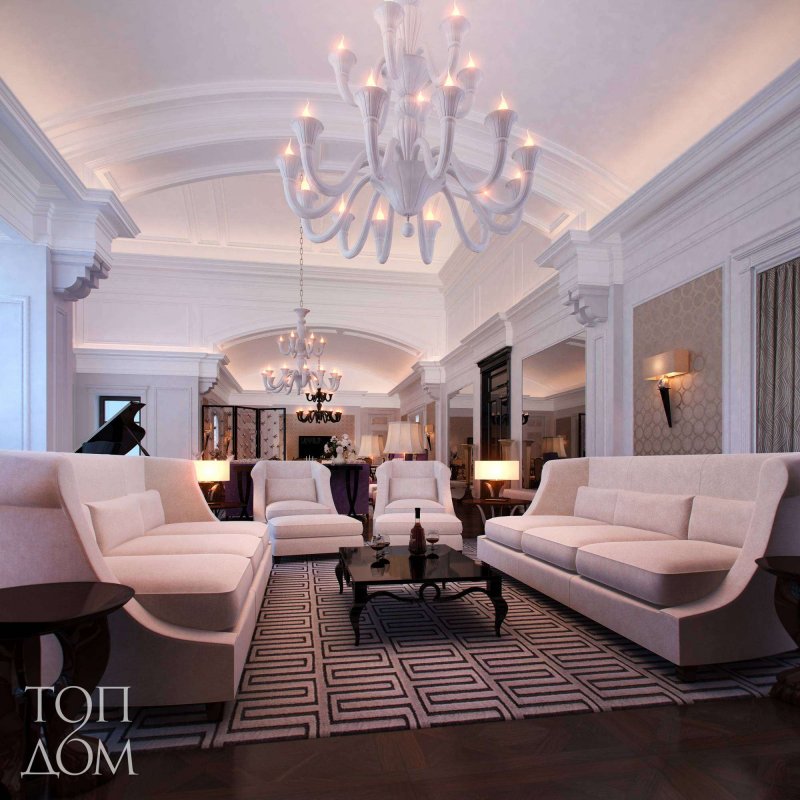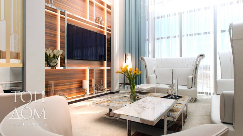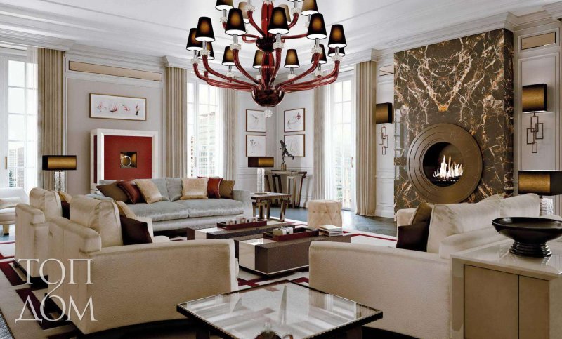 Реализованный в стиле арт-деко интерьер элитной квартиры привлекает внимание цветовыми контрастами и акцентированной декоративностью в форме мебели, светильников, рисунке ковра, скульптурами и живописью, комбинацией матовых и глянцевых фактур в обивке диванов. Обилие декора не нарушает главный принцип современных интерьеров, и пространство гостиной остается открытым за счет большой площади.
