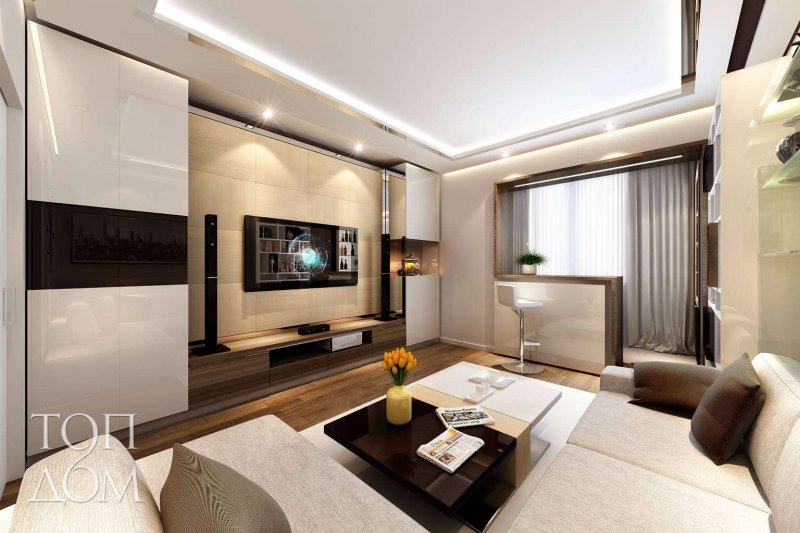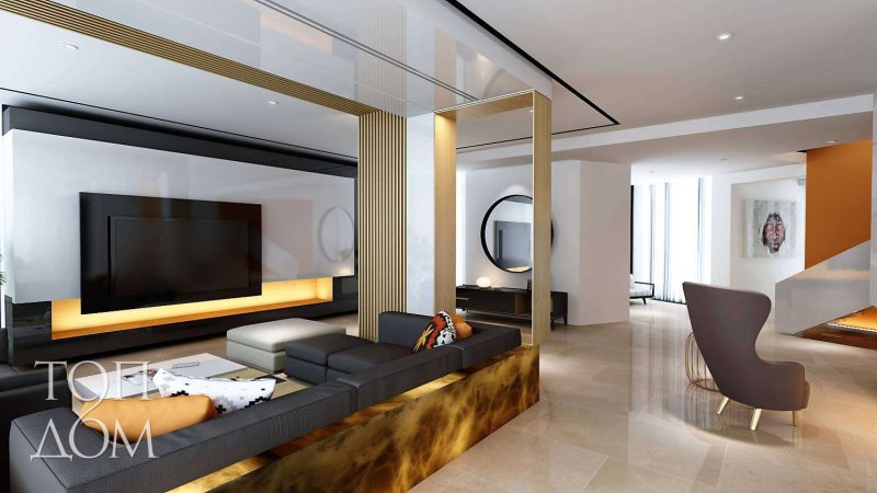Главный тренд – создание открытой планировки. Зрительное зонирование производят с помощью группировки мебели, мобильных перегородок, подиумов, цветовых решений, разницы фактур. Для оформления интерьера современной гостиной характерно: