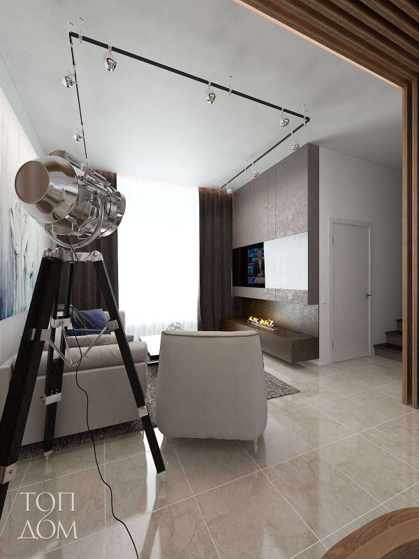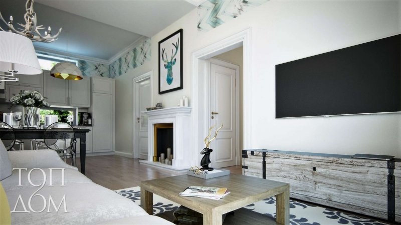 Современный дизайн интерьера гостиной в эклектичном стиле из проекта коттеджа аккуратно миксует классику, минимализм и арт-деко. Светлый фон дает возможность вывести на первый план аксессуары и декораторские решения: многогранный светильник, постер с оленем, тумбу-сундук из состаренного массива, обои с рисунком зигзаг.