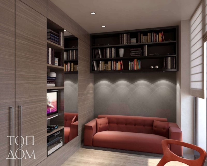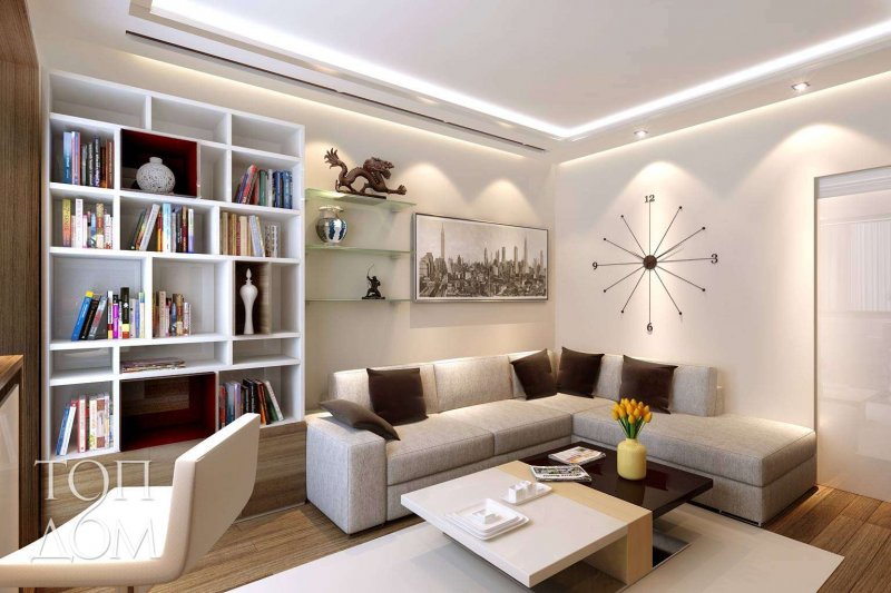 Меблировка предполагает организацию множества мест хранения в виде стеллажей, открытых и закрытых полок, выдвижных секций, встроенных шкафов.