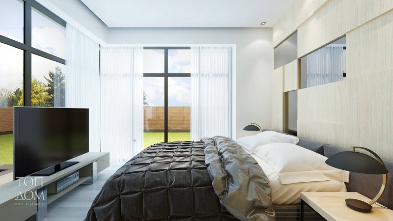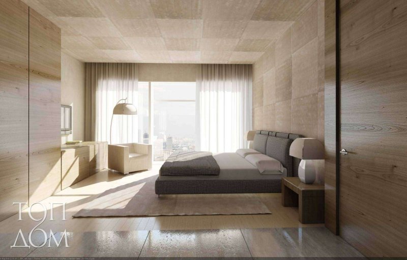 В современном интерьере спальни из квартиры в коричневых тонах акцент сделан на светлые древесные цвета (характерный пример однотонности отделки). Серая тканевая обивка кровати поддержана серой напольной плиткой в зоне санузла. По проекту ванная комната обустроена в одном пространстве со спальней.