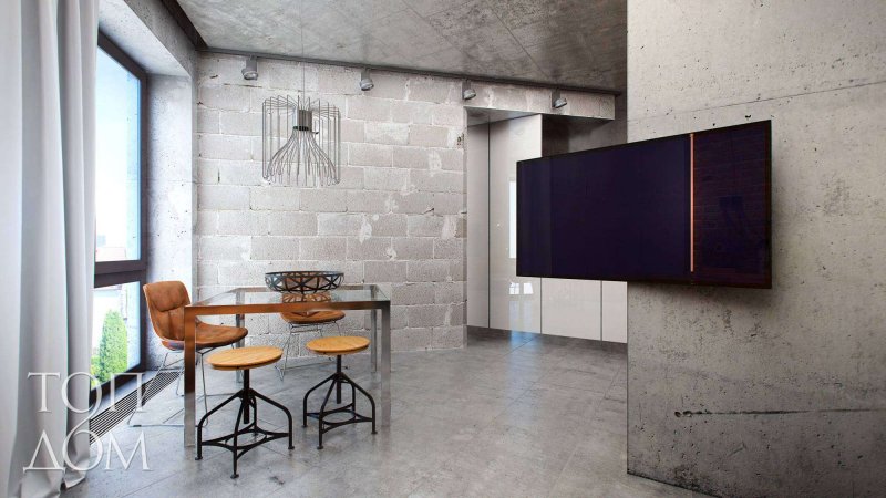минимум отделки, излюбленный прием – штукатурка под бетон на полу и стенах, акцентная стена с состаренной кирпичной кладкой;