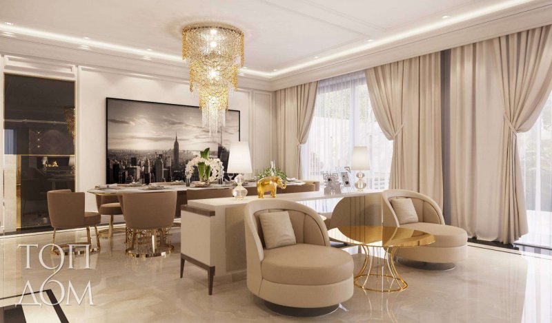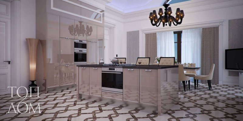 Оформление кухонной зоны из проекта дома в стиле неоклассика использует бежевую гамму. Тон задают глянцевые фасады, напольная плитка и шторы. Просторное помещение разделено на рабочую и обеденную зоны, остров совмещен с барной стойкой. Светло-бежевые поверхности и кремовая обивка стульев красиво контрастируют с черными столешницами, мебельными ножками и люстрой.