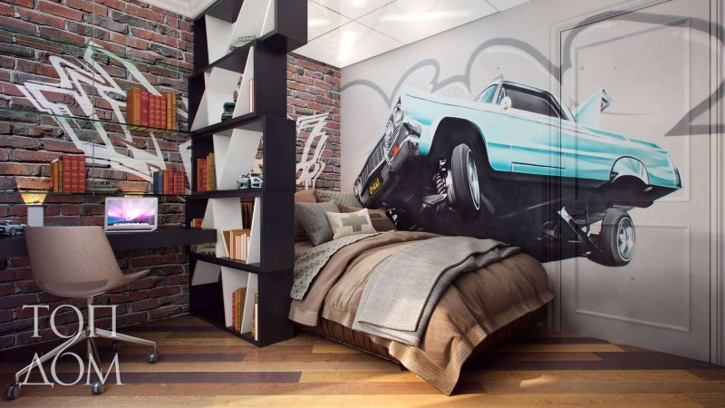 В дизайне 5-комнатной квартиры детская для мальчика-подростка выполнена в стилистике лофт. Акцентная стена отделана кирпичной кладкой с граффити, на соседнюю тоже нанесен яркий принт. Спальную и рабочую зоны разделяет перегородка-стеллаж. Бежево-коричневую гамму комнаты поддерживают кресло-груша и глянцевый шкаф-купе.