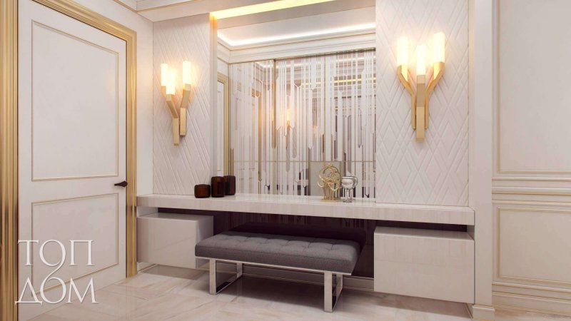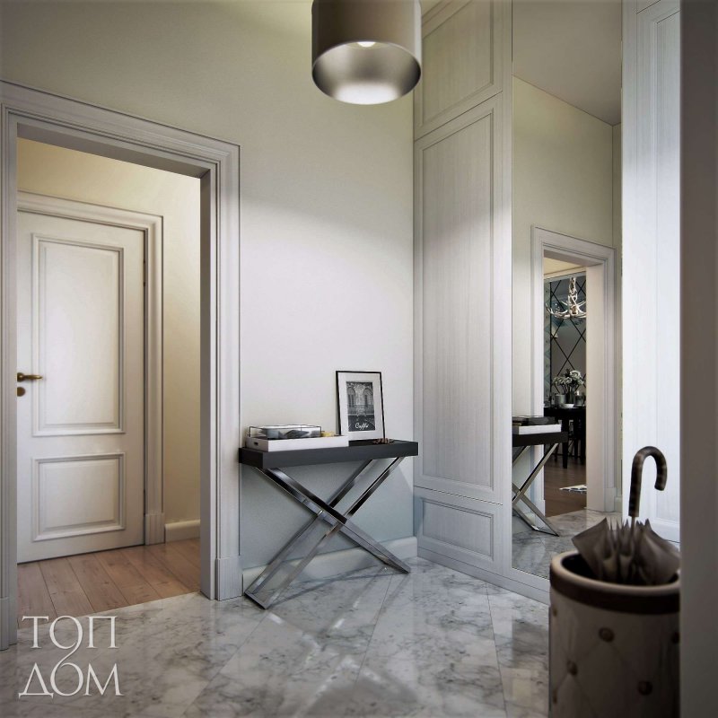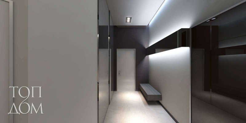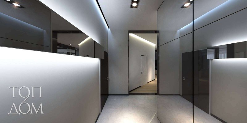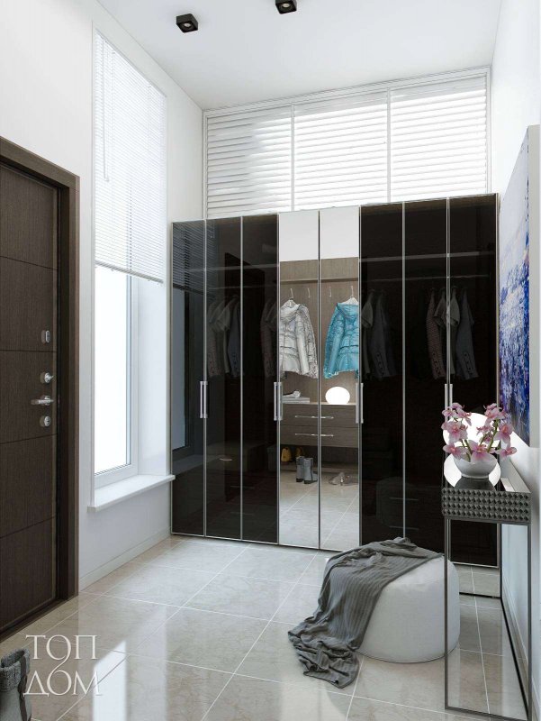 Белая прихожая в современном дизайне из проекта небольшого частного дома смотрится невероятно нарядно. Здесь комбинируются бежевый мрамор, зеркала и тонированные черные фасады гардеробного шкафа.