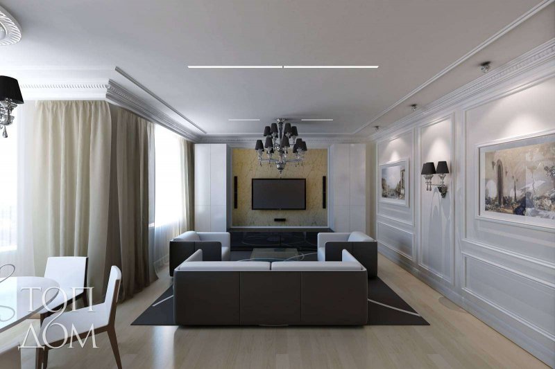 При ремонте 4-комнатной квартиры общественную зону – совмещенные гостиную, столовую и кухню – решено было выполнить в светлом неоклассическом варианте. Стены отделаны молдингами и многоуровневыми карнизами со встроенной подсветкой. Бежевая обивка дивана хорошо сочетается со светло-коричневым деревянным полом.