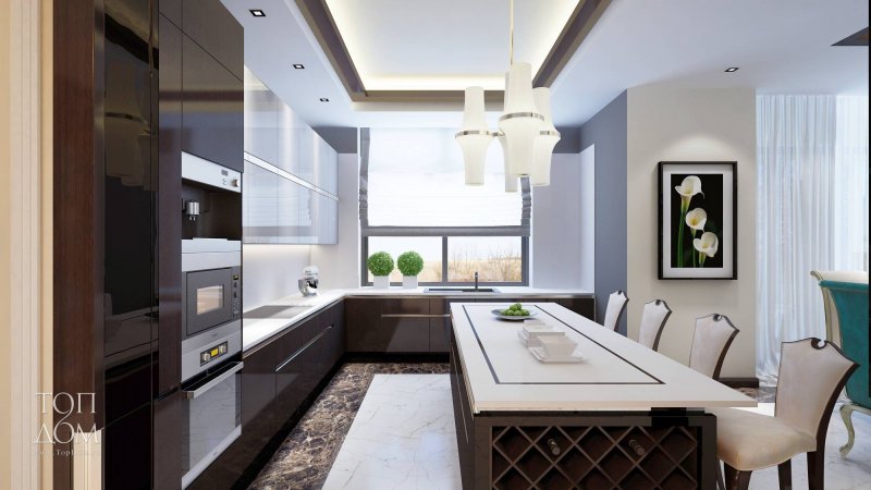 для большой площади характерно островное расположение мебели, популярный прием – объединение острова с барной стойкой;