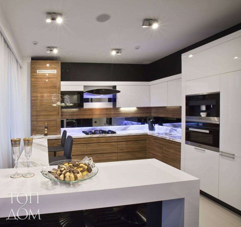Реализованный проект квартиры в футуристическом стиле представляет трехцветную кухню. Образ весьма лаконичный: белые столешницы, лакированные белые и деревянные фасады, черная отделка стены и барной стойки. Зеркальный фартук дополняет современный дизайн.