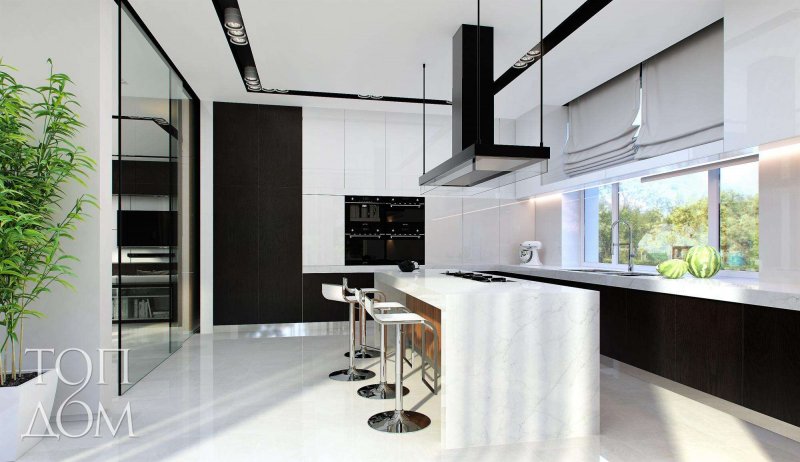 В белом интерьере частного дома зона готовки отделяется прозрачной раздвижной перегородкой. Дизайн кухни минималистичен: черные деревянные и глянцевые белые фасады сочетаются с белыми мраморными столешницами, контрастную гамму смягчает теплый древесный оттенок острова. Встроенный гарнитур без ручек создает иллюзию монолитной стены. Потолочные софиты равномерно освещают рабочую площадку.